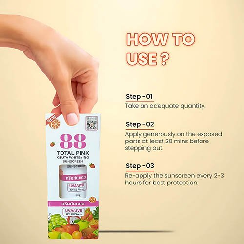 Keep your skin radiant and protected every day with 88 Total Pink Gluta Whitening Sunscreen. Specially formulated with Glutathione, this sunscreen not only shields your skin from harmful UVA/UVB rays but also helps brighten and even out your complexion for a naturally glowing look.