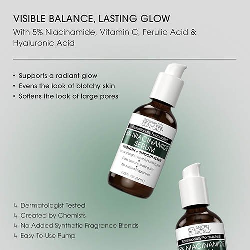 - 5% NIACINAMIDE FACE SERUM VISBILY REFINES TEXTURE & EVENS COMPLEXION – This 5% Niacinamide serum helps visibly reduce the look of uneven skin tone while smoothing rough texture and enhancing hydration. Skin looks more balanced, radiant, and refreshed. Formulated by cosmetic chemists, for women and men looking to visibly even skin texture for a more radiant looking complexion.