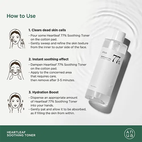 Use after cleansing as both morning & night skincare regimen. With mild ingredients, Anua heartleaf 77% soothing toner may be used everyday. You may apply with a cotton pad or pat with your finger all over the face.