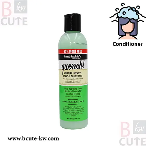 • That’s the sound of your hair exhaling after it drinks in Aunt Jackie’s Quench Leave-In CONDITIONER. Long-lasting moisture, slip and softness are delivered tHAIRough natural CONDITIONERs, including Marshmallow Root, Shea Butter and Extra Virgin Olive Oil.