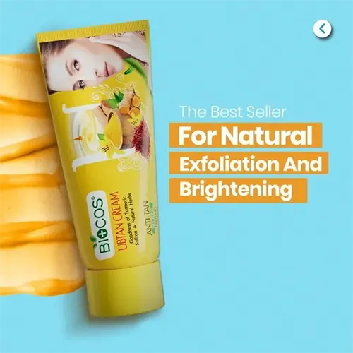 marks and skin pigmentation, thus making your skin flawless and clear. Younger Looking Skin: Biocos Ubtan Cream helps you looking young and fresh. Turmeric is one of the key components of ubtan is known for anti-aging anti- inflammatory and anti-oxidant properties, preventing your skin from wrinkles hence you look younger.