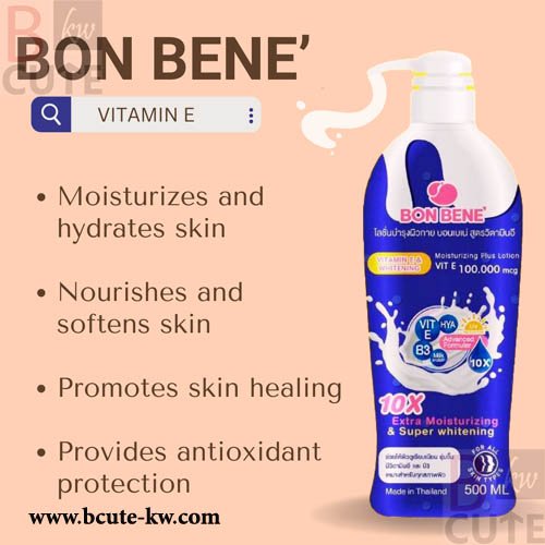 Bon Bene Vitamin E & Whitening Lotion with UV Protection | 500ML | Made in Thailand