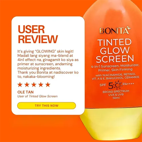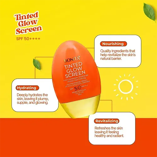 BONITA Tinted Glow Screen is a multifunctional skincare product designed to simplify your daily routine. It combines sun protection, moisturizer, primer, and a subtle illuminating tint in one lightweight formula, helping your skin look naturally radiant while staying hydrated and protected.