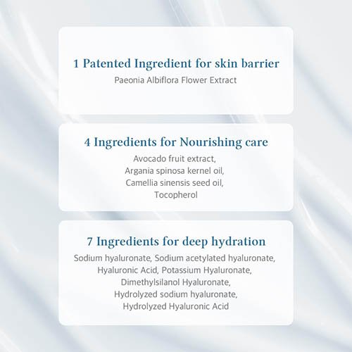 Water, Glycerin, Dipropylene Glycol, Cetearyl Alcohol, Caprylic/Capric Triglyceride, Hydrogenated Polydecene, Methyl Trimethicone, 1,2-Hexanediol, Phenyl Trimethicone, Vegetable Oil, Dimethicone/Vinyl Dimethicone Crosspolymer, Glyceryl Stearate SE, Cetearyl Olivate, Palmitic Acid, Sorbitan Olivate, C12-16 Alcohols, Behenyl Alcohol, Stearic Acid, Hydrogenated Lecithin, Microcrystalline Cellulose, Cetearyl Glucoside, Butylene Glycol, Ethylhexylglycerin, Polyglyceryl-10 Myristate, Ammonium Acryloyldimethyltaurate/VP Copolymer, Glyceryl Polymethacrylate, Cellulose Gum, Ceramide NP, Cholesterol, Coptis Japonica Root Extract, Disodium EDTA, Brassica Oleracea Acephala Leaf Extract, Persea Gratissima (Avocado) Fruit Extract, Artemisia Princeps Leaf Extract, Glyceryl Stearate, Methylpropanediol, Maltodextrin, Hydrolyzed Gardenia Florida Extract, Ceramide AS, Ceramide AP, Guaiazulene, Arginine, Carbomer, Ceramide NG, Ceramide NS, Tocopherol, Hydrolyzed Sodium Hyaluronate, Hydrolyzed Hyaluronic Acid, Dimethylsilanol Hyaluronate, Paeonia Albiflora Flower Extract, Potassium Hyaluronate, Hyaluronic Acid, Sodium Hyaluronate, Sodium Hyaluronate Crosspolymer, Hydroxypropyltrimonium Hyaluronate, Sodium Hyaluronate Dimethylsilanol, Sodium Acetylated Hyaluronate, Ceramide EOP