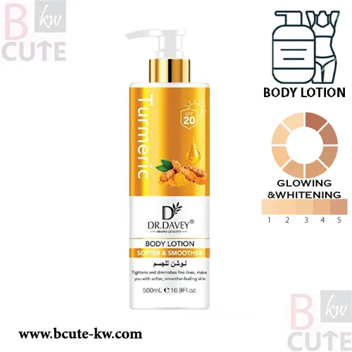 The Dr. Davey Turmeric Body Lotion Softer & Smoother (DV-6712) is a nourishing, quick-absorbing body lotion that brightens, hydrates, and transforms dry skin. Infused with turmeric extract and vitamin C, it evens tone, reduces wrinkles, restores moisture barrier, and promotes silky-smooth texture ideal for daily use on all skin types seeking brighter, healthier-looking body skin.