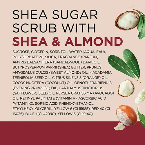 Sucrose, Glycerin, Polysorbate 20, Silica, Fragrance (Parfum), Amyris Balsamifera Bark Oil, Butyrospermum Parkii (Shea) Butter, Citrus Sinensis (Orange) Oil, Prunus Amygdalus Dulcis (Sweet Almond) Oil, Macadamia Ternifolia Seed Oil, Cocos Nucifera (Coconut) Oil, Oenothera Biennis (Evening Primrose) Oil, Carthamus Tinctorius (Safflower) Seed Oil, Persea Gratissima (Avocado) Oil, Retinyl Palmitate (Vitamin a), Ascorbic Acid (Vitamin C), Sorbic Acid, Juglans Regia (Walnut) Shell Powder, Phenoxyethanol, Ethylhexylglycerin, Yellow 6 (CI 15985), Red 40 (CI 16035), Blue 1 (CI 42090), Yellow 5 (CI 19140).