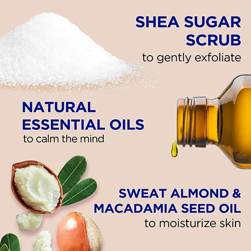 SUCROSE, GLYCERIN, POLYSORBATE 20, SILICA SILYLATE, FRAGRANCE (PARFUM), AMYRIS BALSAMIFERA BARK OIL, BUTYROSPERMUM PARKII (SHEA) BUTTER, CITRUS SINENSIS (ORANGE) OIL, PRUNUS AMYGDALUS DULCIS (SWEET ALMOND) OIL, MACADAMIA TERNIFOLIA SEED OIL, COCOS NUCIFERA (COCONUT) OIL, OENOTHERA BIENNIS (EVENING PRIMROSE) OIL, CARTHAMUS TINCTORIUS (SAFFLOWER) SEED OIL, PERSEA GRATISSIMA (AVOCADO) OIL, RETINYL PALMITATE (VITAMIN A), ASCORBIC ACID (VITAMIN C), SORBIC ACID, JUGLANS REGIA (WALNUT) SHELL POWDER, PHENOXYETHANOL, ETHYLHEXYLGLYCERIN.