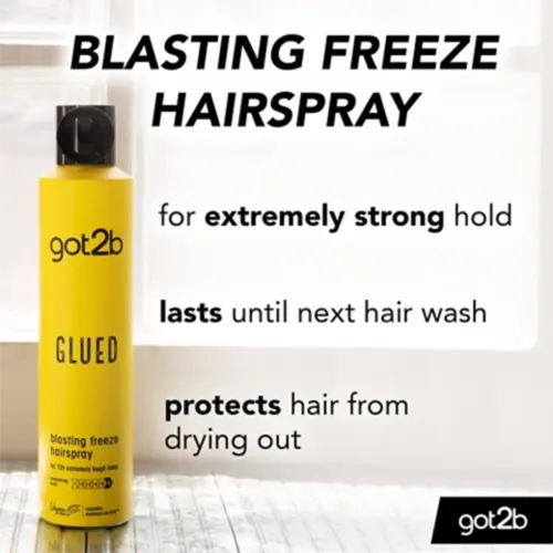 Looks like a spray, holds likea glue! got2b Glued Balsting Freeze Hairspray freezes your looks until the next hair wash. Express yourself and create spunky hairstyles that last up to 72h.