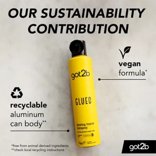 This got2b Glued Blasting Freeze Hairspray is made to create extremely tough looks. Our unique formula lets you shapeshift your hairstyles without having to worry about your hair feeling sticky or dry. Best of all, the vegan* formula contains 46,3% natural-derived ingredients** and comes in an recyclable aluminium can body***.