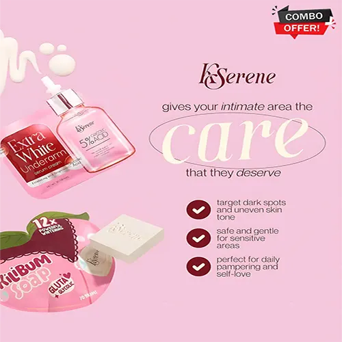 Transform your skincare routine with the KSerene Combo Pack, your all-in-one solution for brighter, smoother, and more even-toned skin. This powerful duo combines the exfoliating and whitening benefits of KSerene Extra White Underarm Serum Cream and KSerene Kilibum Soap, giving you soft, radiant, and glowing skin from head to toe.
