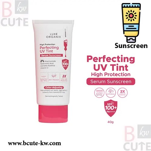 “Luxe Organix High Protection Perfecting UV Tint Serum Sunscreen SPF 50 PA +++ 40g is a lightweight and non-sticky tinted hybrid sunscreen with SPF100 PA++++ UVA/UVB broad spectrum protection. With its advanced color-adjusting formulation, this tinted sunscreen evens out the skin tone and instantly brightens the complexion, while protecting the skin against external pollution.