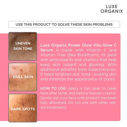 - Luxe Organix Power Glow Serum is packed with Vitamin C to give your skin the radiant glow that it deserves.