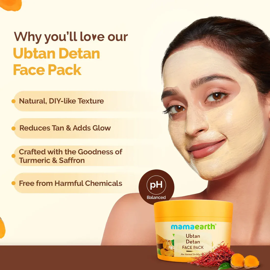 DIY face masks seem like a good idea until the mess and potential skin irritation ruin the fun. Put an end to the hassle with our all new skin friendly, pH balanced Mamaearth Ubtan Detan Face Pack featuring a DIY-like texture! Inspired by age-old beauty rituals, it is crafted with the potent blend of turmeric and saffron to give you a healthy glow.