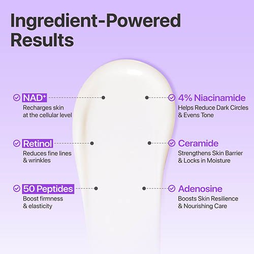 [KEY INGREDIENTS] Formulated with NAD+, a powerful anti-aging ingredient that supports collagen production and skin repair, along with 50 types of peptides to plump and firm the skin. Retinol smooths skin and reduces the look of wrinkles, while ceramide nourishes and strengthens the delicate eye area. Niacinamide brightens dark circles and rejuvenate the entire eye area restoring vitality and radiance.