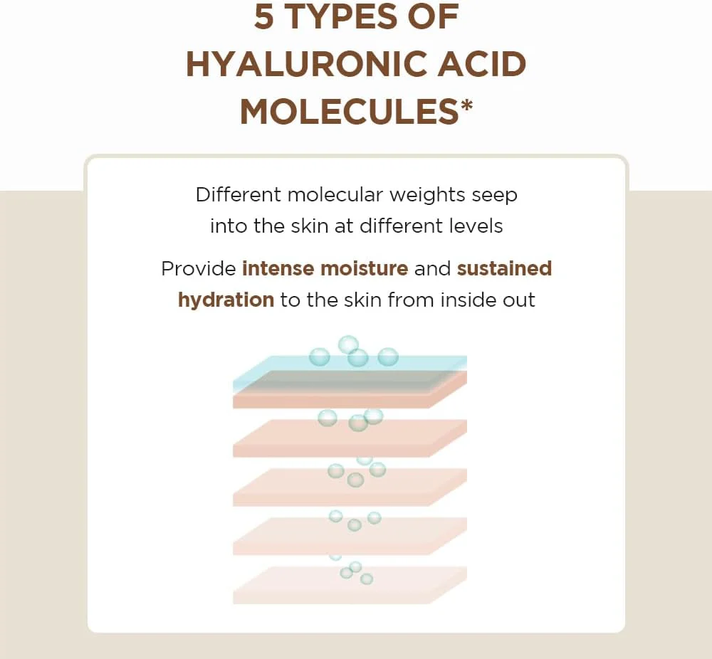 – Contains 5 sizes of hyaluronic acid molecules to layer moisture into the skin from the inside out