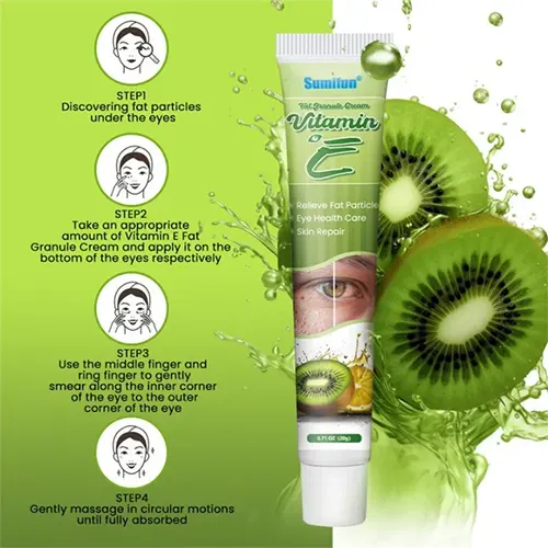 Sumifun Vitamin E Eye Cream for Fat Particles is specially designed to reduce fat particles, fine lines and dark circles around the eyes. Rich in natural vitamin E and a variety of plant essences, it deeply moisturizes the skin around the eyes, enhances skin elasticity, reduces puffiness, and makes the eyes glow with youthful radiance. Light texture, quick absorption, non-greasy, suitable for all skin types.