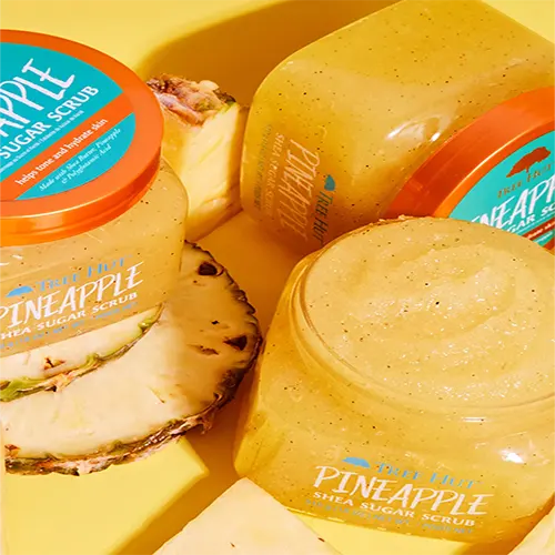Boost your shower routine, scrub away the day and reveal soft, glowing skin with the succulent scent of Pineapple! Made with Sugar, Shea Butter,Pineapple Enzymes, Polyglutamic Acid and an array of natural oils including Evening Primrose, Avocado, Macadamia, Sweet Almond, Safflower and Orange Oils.