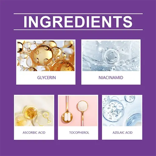 Glycerin in Azelaic Acid Cream has a moisturizing effect that helps increase the moisture content of the skin and keep it hydrated.Niacinamide, a form of vitamin B3, helps to improve the surface texture of the skin and reduce dryness and flaking.Vitamin C (ascorbic acid) helps brighten the skin.Azelaic acid helps to keep the skin fresh and comfortable.The above ingredients work together to provide comprehensive care and protection for skin that looks smoother, more even and healthier.